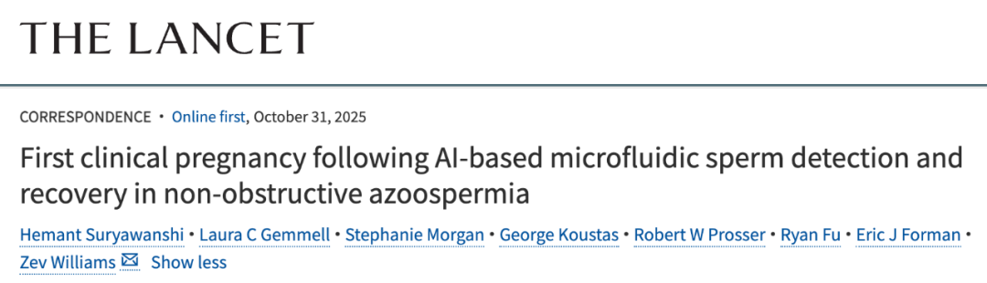 2025 年 10 月 31 日,哥伦比亚大学医学中心的研究人员在国际顶尖医学期刊《柳叶刀》(The Lancet)发表了题为:First clinical pregnancy following AI-based microfluidic sperm detection and recovery in non-obstructive azoospermia 的研究论文。